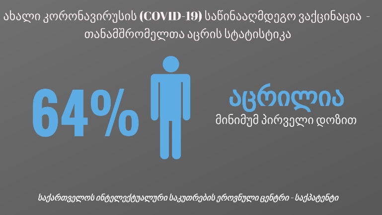 საქართველოს ინტელექტუალური საკუთრების ეროვნული ცენტრი – საქპატენტი უსაფრთხო სამუშაო გარემოს შექმნაზე ზრუნავს. დღეის მდგომარეობით უწყების თანამშრომელთა 64%-ი ვაქცინირებულია ახალი კორონავირუსის (COVID-19) საწინააღმდეგო აცრის მინიმუმ პირველი დოზით.