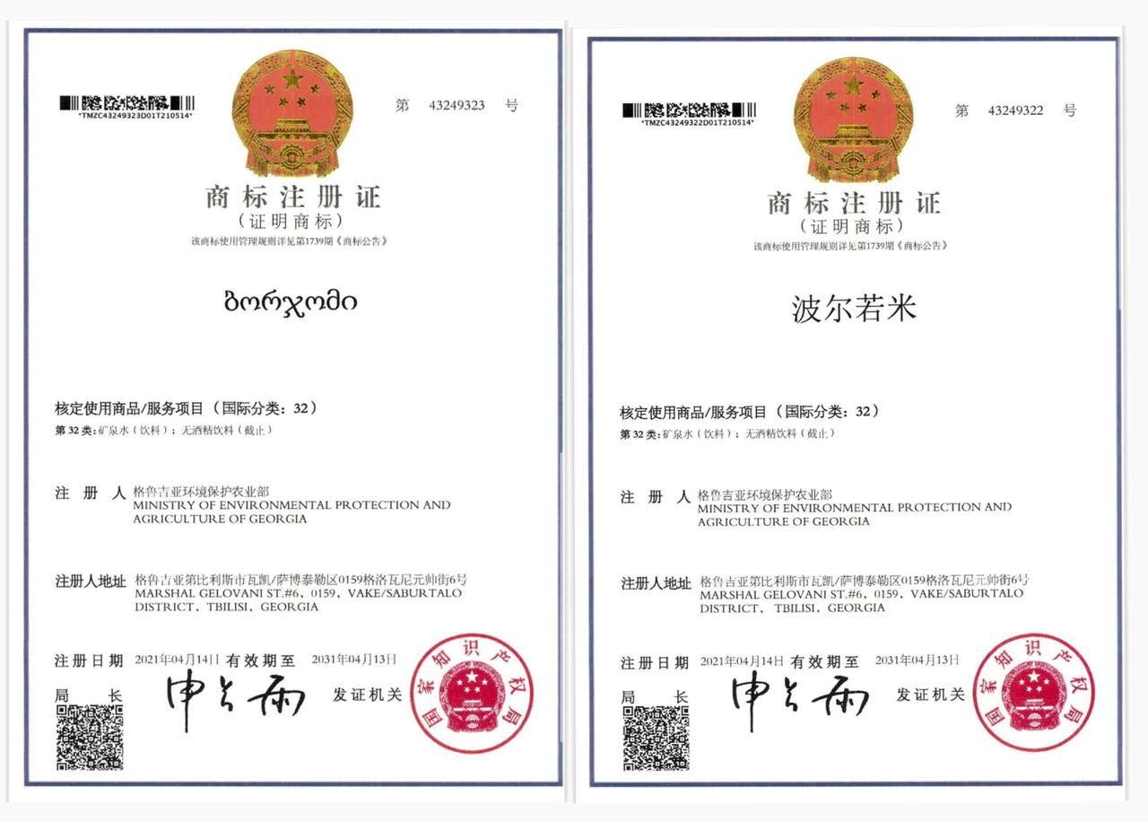 ჩინეთის სახალხო რესპუბლიკაში, ქართული ადგილწარმოშობის დასახელება “ბორჯომი“, ინტელექტუალური საკუთრების ეროვნული ცენტრის - საქპატენტის მიმართვის საფუძველზე დარეგისტრირდა.