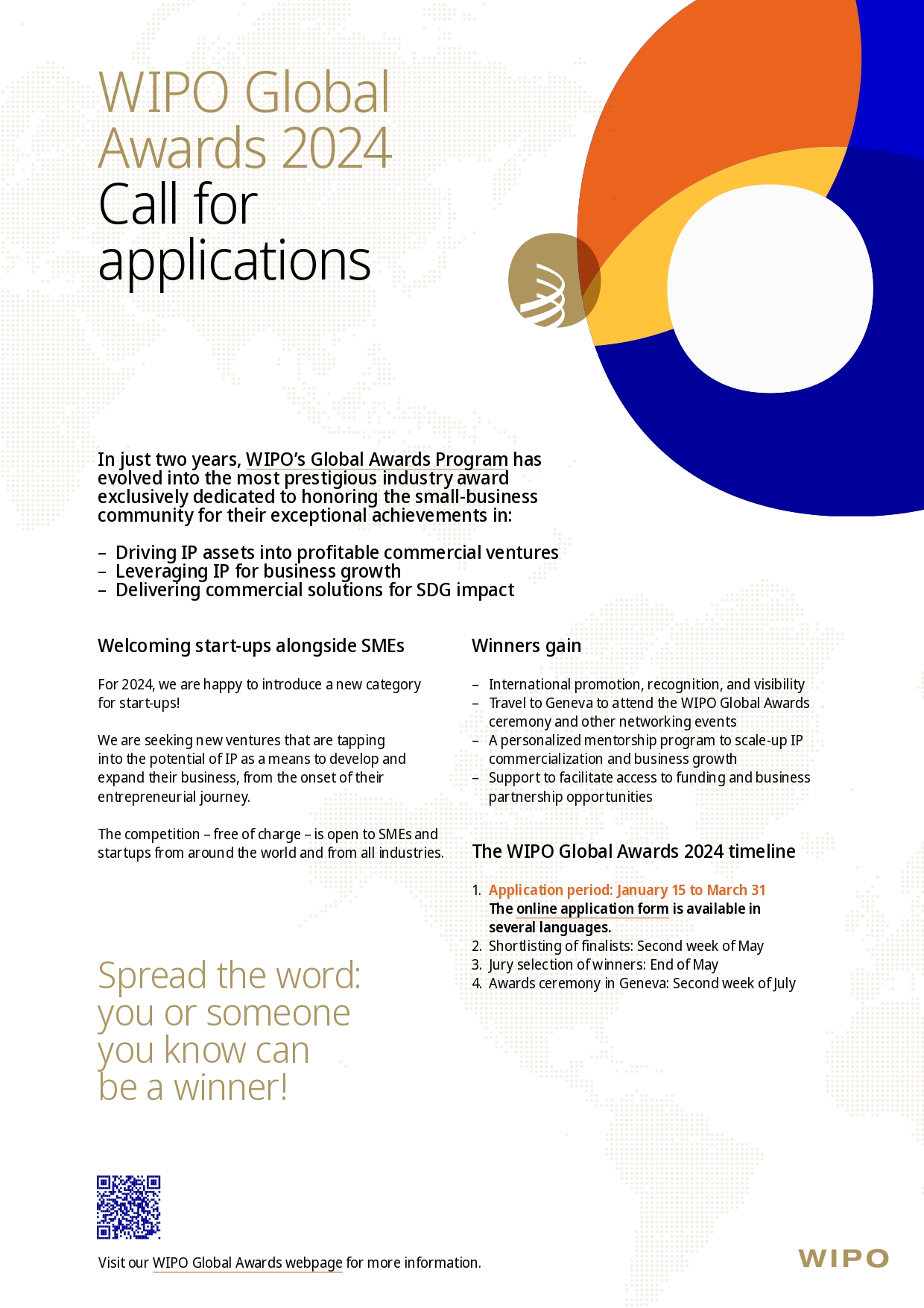ინტელექტუალური საკუთრების მსოფლიო ორგანიზაციამ (WIPO) გლობალური დაჯილდოების კონკურსი 2024 გამოაცხადა. კონკურსის მიზანია ხელი შეუწყოს ინტელექტუალური საკუთრების პოტენციალის გამოყენებას სამეწარმეო საქმიანობაში. კონკურსი გამოავლენს იმ კომპანიებს, ფიზიკურ პირებს, გამომგონებლებს, ავტორებსა თუ მეწარმეებს, რომლებიც თავისი ინოვაციური თუ შემოქმედებითი საქმიანობით ხელს უწყობენ პროგრესსა და ზრუნავენ საზოგადოების კეთილდღეობაზე. კონკურსი წარმოაჩენს მათ მიერ ინტელექტუალური საკუთრების გამოყენებით მიღებულ მიღწევებს და დამსახურებებს, კერძოდ, შემოსავლის მიღების შესაძლებლობებს, ახალი სამუშაო ადგილების შექმნას, ადგილობრივი და გლობალური ამოცანების გადაჭრას ინოვაციების, შემოქმედებითი დარგების, ინვესტიციებისა და ბიზნესის ხელშეწყობით.